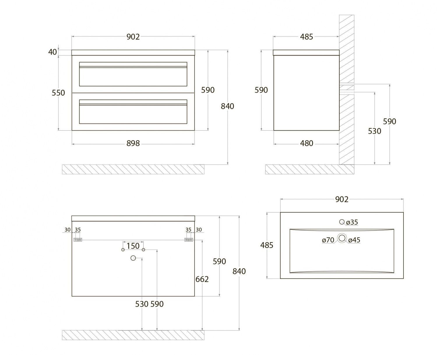 Комплект подвесной мебели для ванной комнаты с раковиной из искусственного мрамора