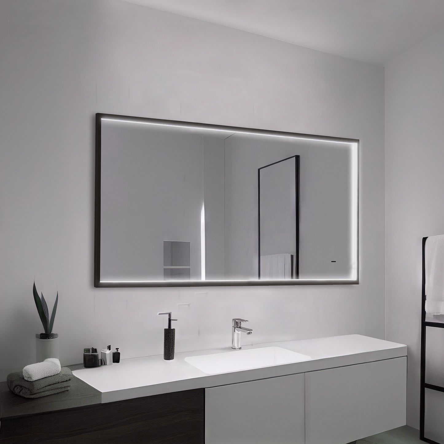 Оснащено LED-подсветкой по внутреннему контуру рамы.